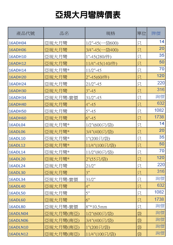 新商品 管類 另件類 電料類 閥類 衛浴設備類 五金類 工具類 Home > 型錄下載 > 新商品 Preview 大山電線電纜 Preview 南亞另件售價牌價 Preview 南亞管件牌價表 Preview 亞規大月彎牌價表 Preview 日泰凡而 Preview 40S鍍鋅鋼管牌價表